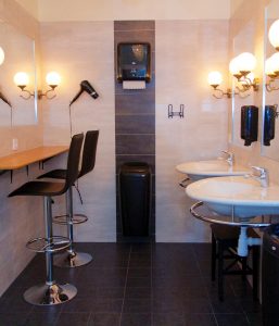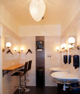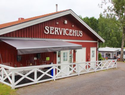 Stora servicehuset är en röd/vit träbyggnad på 250 kvm. Nyrenoverad, massor av toaletter/handfat och duschar.