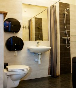 Handikapptoa/dusch och baby rum med en kajak som baby bad.