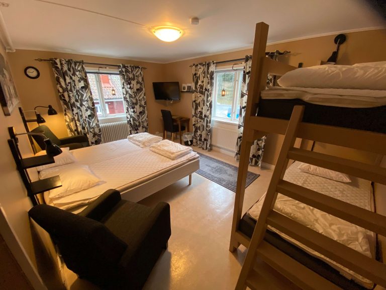 Mysigt nyrenoverat 4-bäddsrum. Täcke och kudde finns. Två fåtöljer, platt-TV, två fönster. Dusch och toalett strax utanför. Tillgång ett stort allrum med soffa, tv, köksbord och stolar, litet kök, kyl, mikro, ugn, kökstillbehör.