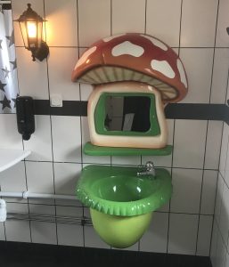 I det ena familjerummet finns ett barnhandfat med spegel som ser ut som en svamp