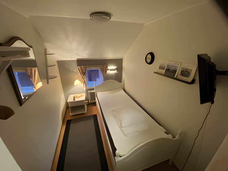 Täcke och kudde finns. TV. Sängbord, lampa, ett litet fönster.