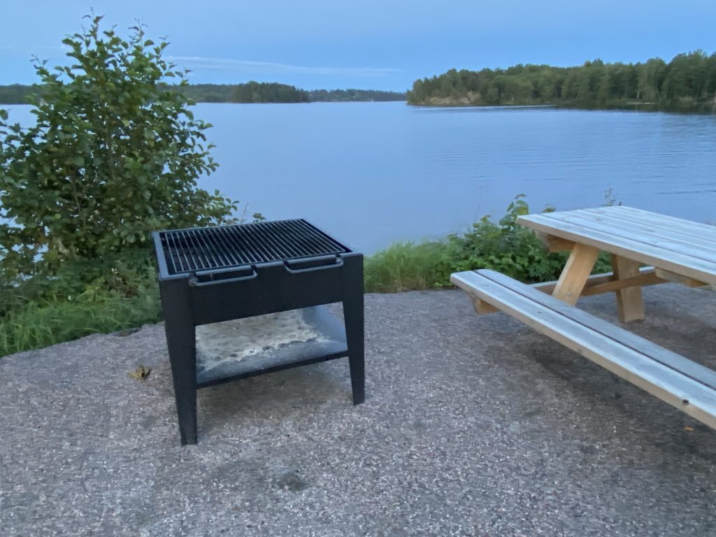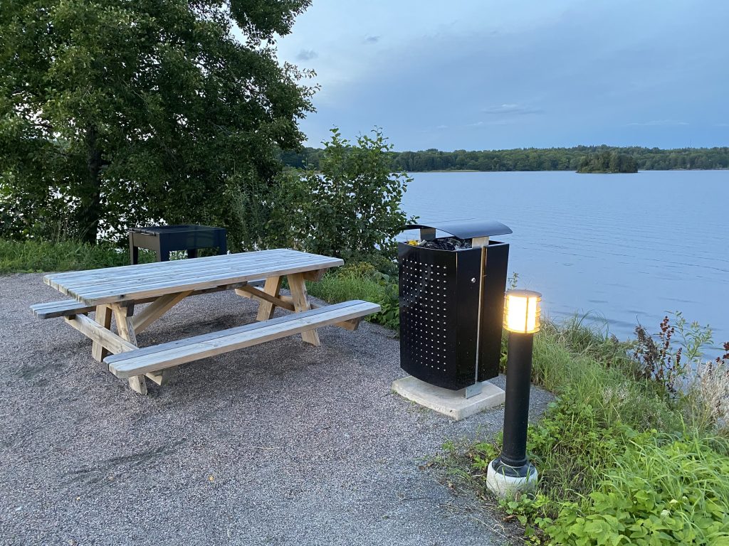 Nu är vi där och klipper, trimmar och rensar ogräs var och varannan vecka. El finns nu för de som är incheckade. Samt en grillplats precis intill vattnet.